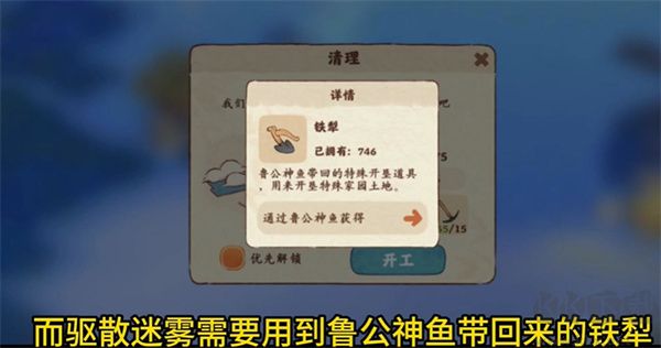 3、要想驅(qū)散迷霧,還得解鎖更大的區(qū)域,直接使用魯公神魚帶回來的鐵犁。