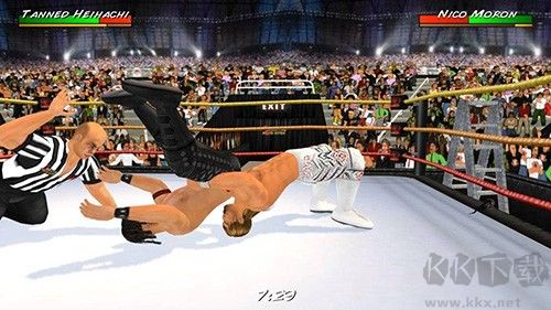 3、在摔跤革命3d中我們可以看到遠(yuǎn)景中賽場(chǎng)外萬千人的歡呼,也可以看到各種閃爍的燈光;