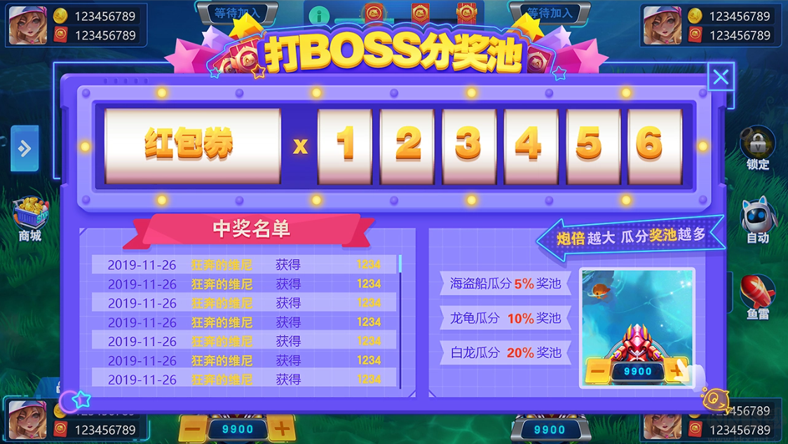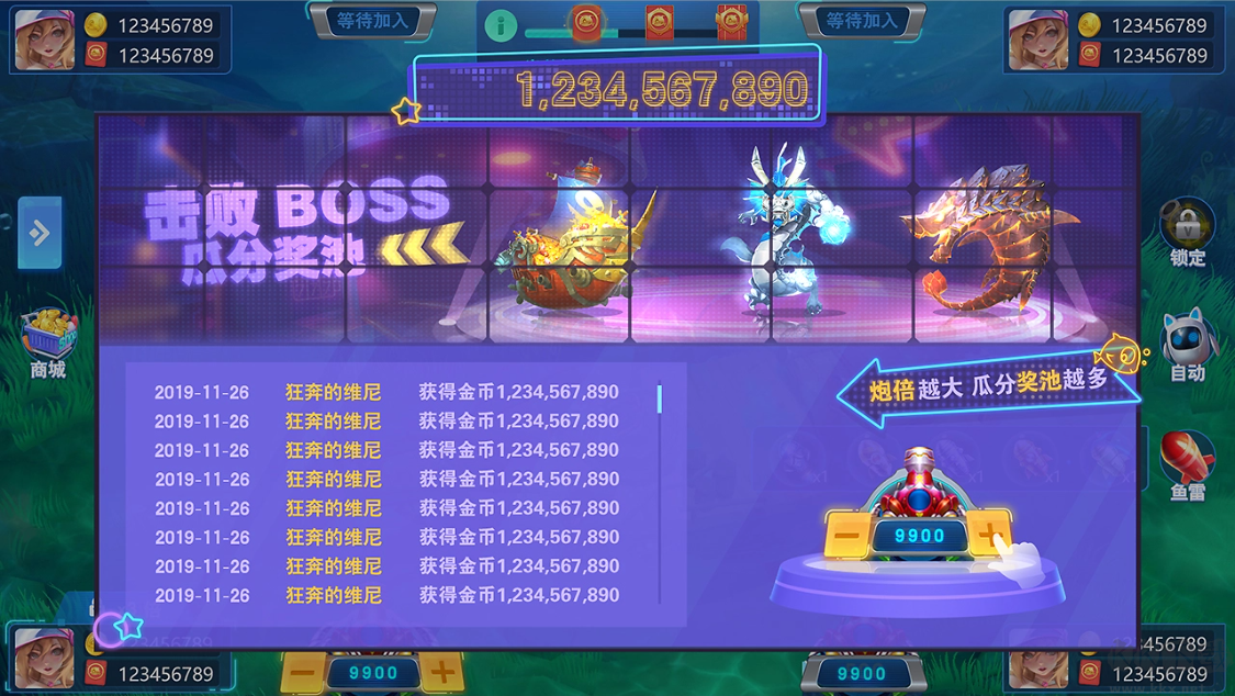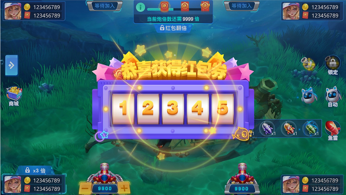 2、定屏、加速、鎖定等酷炫技能,玩家可借此對(duì)魚群進(jìn)行狂轟濫炸,制霸海底。