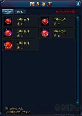 點(diǎn)擊背包界面中的【商店】按鈕,可以進(jìn)入上圖所示的個(gè)人的隨身商店,玩家可在其中購(gòu)買常用的道具。