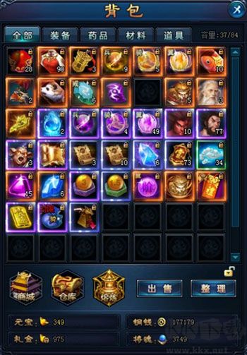 五個(gè)標(biāo)簽-【全部】【裝備】【材料】【道具】【藥品】,點(diǎn)擊不同標(biāo)簽可以查看不同類型的道具。
