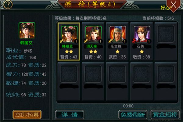 進(jìn)入游戲后,您將會(huì)發(fā)現(xiàn)自身?yè)碛幸晃痪饕约耙幻砷L(zhǎng)值達(dá) 350 以上的將領(lǐng)。鑒于將領(lǐng)是伴隨自身等級(jí)的提升而逐步晉升的,在游戲后期招募新將領(lǐng)時(shí),替換難度較大。并且,若排除運(yùn)氣因素的影響,系統(tǒng)在酒館等級(jí)較低、僅能刷新出兩三名將領(lǐng)時(shí),刷新出黃色或紫色品質(zhì)將領(lǐng)的概率相對(duì)較高;而當(dāng)酒館等級(jí)提升至可一次刷新六七名將領(lǐng)時(shí),高品質(zhì)將領(lǐng)出現(xiàn)的頻率則明顯降低。因此,若您期望在游戲前期擁有優(yōu)秀將領(lǐng),務(wù)必在酒館等級(jí)尚低之時(shí),使用黃金進(jìn)行多次刷新操作,并保留成長(zhǎng)值在 370 以上的黃色品質(zhì)將領(lǐng)。經(jīng)過(guò)后續(xù)幾次培養(yǎng),這些黃色品質(zhì)將領(lǐng)有較大可能成長(zhǎng)為紫色品質(zhì)將領(lǐng)。