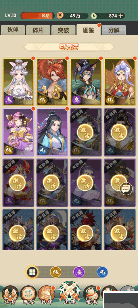 在伙伴界面即可找到圖鑒入口。在此界面,能夠激活已獲取的角色,激活后將獲得一定的全隊(duì)屬性加成。值得注意的是,無(wú)論激活的是何種品質(zhì)的伙伴,均可實(shí)現(xiàn)屬性提升,這無(wú)疑是一項(xiàng)極為實(shí)用的功能。