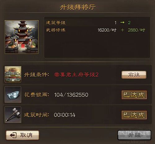 拜將廳,從其名稱含義可知,乃是獲取武將之處。然而,切不可輕視拜將廳的作用。提升拜將廳的等級,能夠增加武將修煉時所獲得的經(jīng)驗值。倘若再疊加練功令的加成效果,每日可免費獲取的經(jīng)驗量頗為可觀。長此以往累計下來,便能夠擁有更為顯著的經(jīng)驗優(yōu)勢。而這些經(jīng)驗優(yōu)勢,實際上便是戰(zhàn)斗力的一種體現(xiàn)。