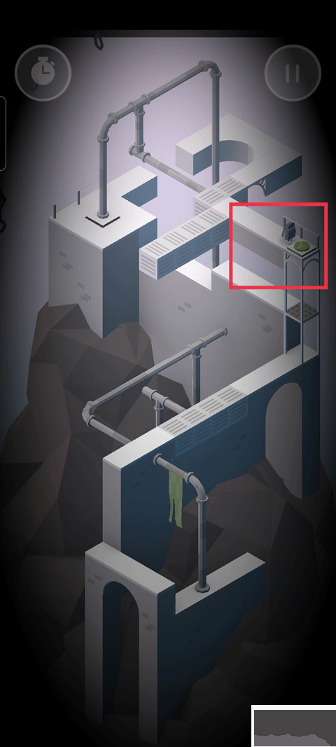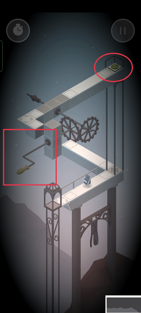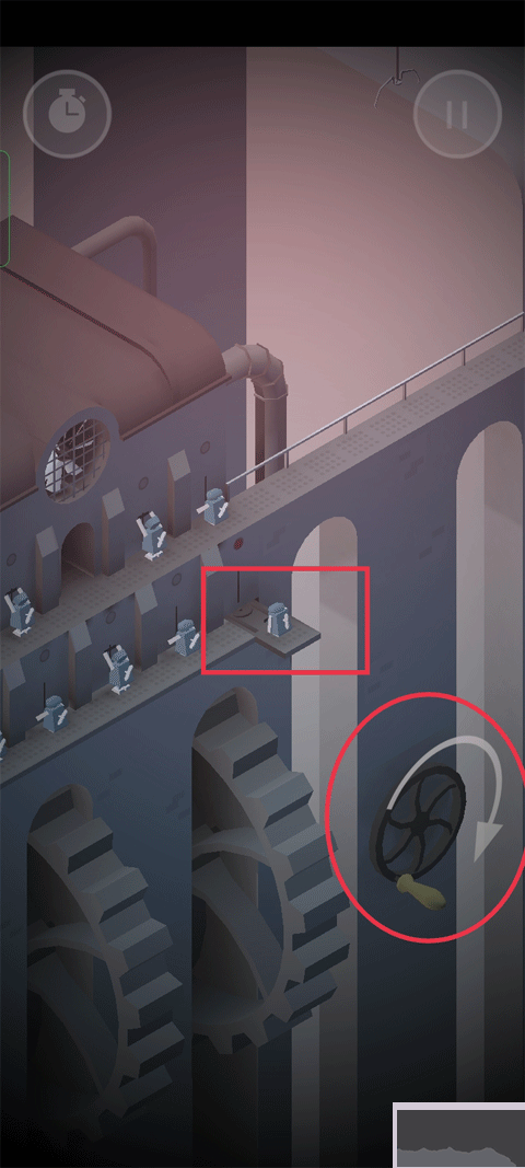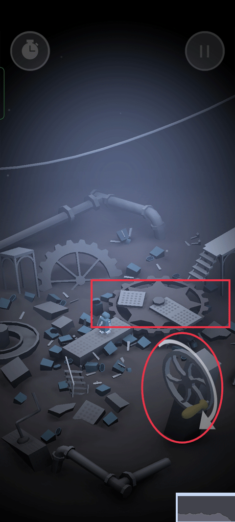 需選擇紅色邊框標識的把手進行轉動,以此鋪設供機器人持續(xù)行進的路線,直至抵達綠色按鈕所在位置。