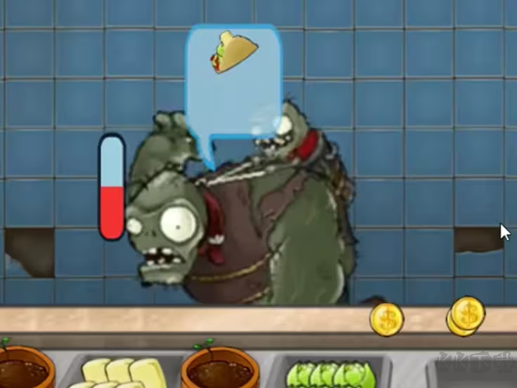 5、每一個(gè)僵尸都有一個(gè)耐心值,在耐心消耗完之前把沙威瑪給僵尸就可以獲得金幣
