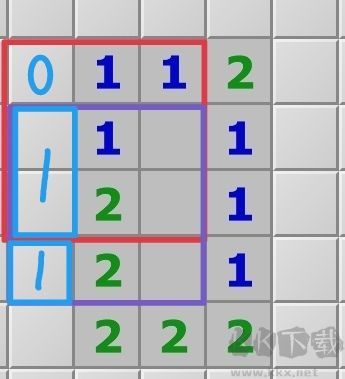 3、如上圖所示,依據(jù)掃雷規(guī)則,能夠較為輕松地推斷出左側(cè)雷的分布情況。具體而言,由于紅色框的中間數(shù)字為 1,所以紅色框內(nèi)左邊的三個格子中僅有一枚雷。同理,紫色框的左邊會有兩枚雷,且這兩枚雷分布在兩個藍(lán)色框內(nèi)。