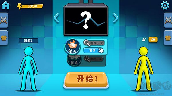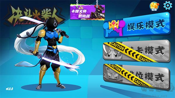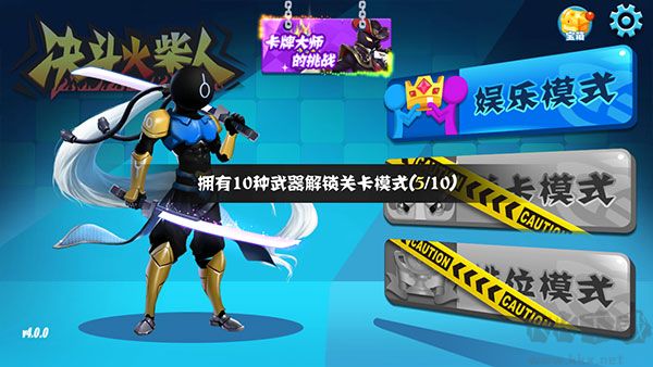 2、點(diǎn)擊進(jìn)入娛樂模式。在此模式下,可依據(jù)自身偏好選擇單人闖關(guān)或雙人闖關(guān),同時(shí)還能對火柴人的武器與服裝進(jìn)行選擇 。