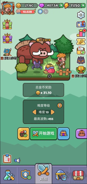 這個時候這個時候怪的血量又變大了,但是攻擊相較于你的生命成長速度而言變低了,而且防御欄目的一些東西也可以拉滿了(工作坊升不動就到局內(nèi)用肉升滿),所以這個時候防御欄目主【生命】+【擊退概率】【擊退力】盡量拉滿+【傷害減免】【荊棘防御】【護(hù)衛(wèi)速度+數(shù)量】【沖擊波大小+頻率】拉滿,肉升拉不滿的就好。這段時間的目的就是瘋狂沖擊難度8第100,其次要盡量升滿收益欄目【金幣百分比獎勵】【肉百分比獎勵】【免費(fèi)升級攻擊+防御+收益】最后打通難8第100波解鎖護(hù)衛(wèi)傷害,便于你可以開啟第四階段擊退護(hù)衛(wèi)流