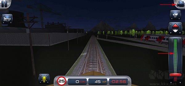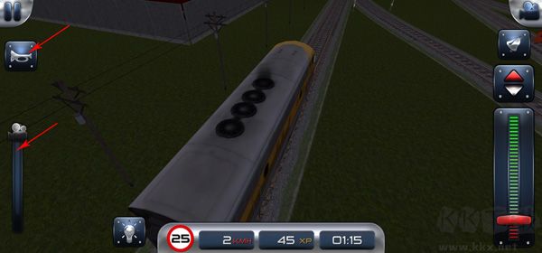 7、右側自上至下的按鈕依次為切換火車視角按鈕、鈴鐺按鈕、前后檔位按鈕以及用于控制火車行駛的檔把;