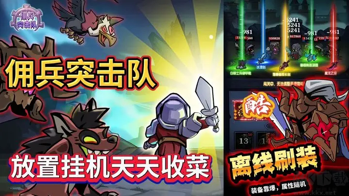 傭兵突擊隊(duì)是一個(gè)輕松放置,絕不傷肝的休閑放置手游。Q版暗黑系的美術(shù)風(fēng)格,當(dāng)前游戲版本主要能體驗(yàn)到的玩法有,離線刷裝,神裝搜集,技能自由搭配,無(wú)限闖關(guān)等。