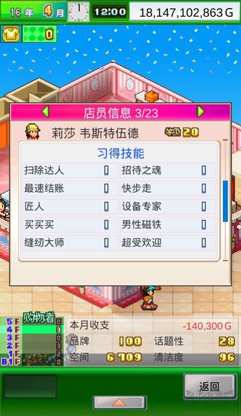 時(shí)尚洋品店物語(yǔ)是一款經(jīng)營(yíng)店鋪的游戲,它還是開羅家族那可愛的2D像素畫風(fēng),小人在店里跑來跑去,萌得很,這次你要經(jīng)營(yíng)一家開在黃金地段的時(shí)尚精品店,得想法子吸引好多顧客來買東西,把店變得超有人氣,?玩法有很多,能雇店員整理店鋪、給顧客推薦衣服,還能賣衣服、裝飾模特、搞促銷,只要能讓顧客滿意、賺到錢,咋玩都行,攢夠錢后,能上新貨、裝修、辦活動(dòng),目標(biāo)是把店做成城市最大的時(shí)尚洋品店,感興趣的小伙伴就快來kk網(wǎng)站下載體驗(yàn)一下吧。