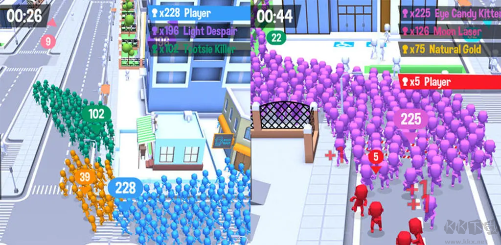 擁擠城市是一款非常魔性的游戲,游戲畫面是很簡(jiǎn)單的建模,幾何體的各種顏色的小人,狼,蛇,蜘蛛之類的東西。游戲操作也很簡(jiǎn)單,手指在屏幕上劃動(dòng)就能控制角色走動(dòng)的方向。在城市中召集最大陣容! 城市游走圈粉,收集散落人群,同化其他小團(tuán)體,組成超強(qiáng)陣容!