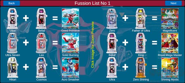 4、點擊 “Fussion List”,即可查看不同膠囊所能合成的奧特曼種類;