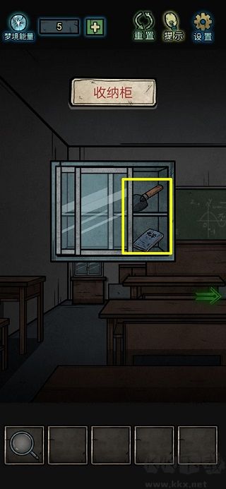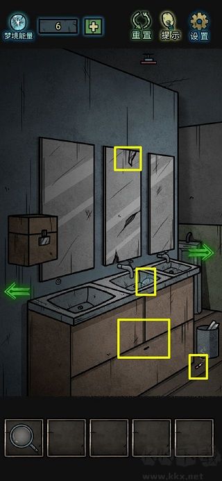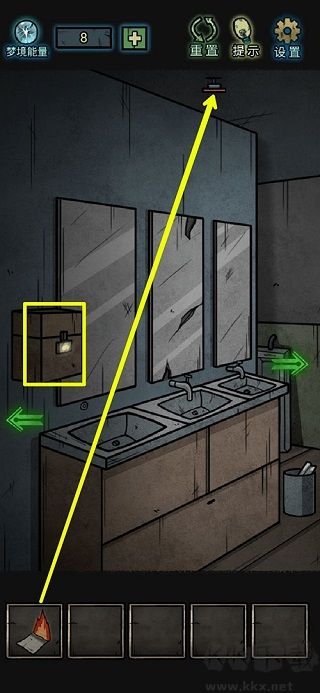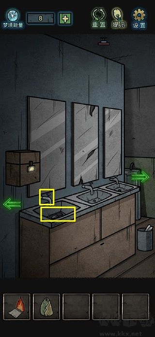 8、鏡子上拾取玻璃碎片,洗手臺里一個夢境能量;打開沒上鎖的柜子,獲得扳手和半個碎片;