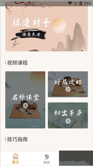 1、開(kāi)啟五子棋單機(jī)版 APP,界面設(shè)有首頁(yè)、挑戰(zhàn)、我的三大板塊。其中,首頁(yè)主要展示五子棋課程視頻及相關(guān)小技巧;
