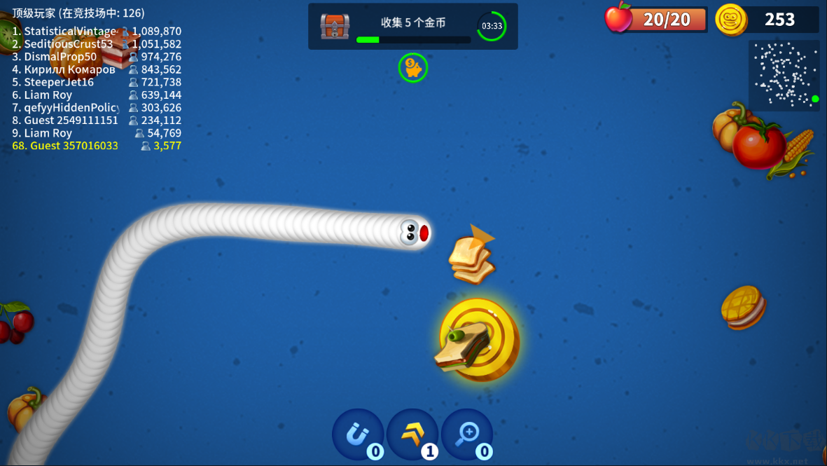 2、留意周邊狀況:得時刻關注周圍。要是發(fā)現(xiàn)有別的貪吃蛇也跟上來了,最好先避開。因為一旦它們打起來,場面混亂,你很可能被殃及,非但撿不到漏,還成了別人的 “盤中餐”。等它們混戰(zhàn)結(jié)束,局勢明朗了,再找準時機上去撿漏。