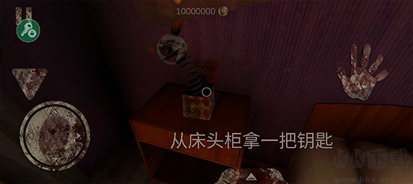 1.男主角于床上蘇醒,系統(tǒng)提示其藏身于床底。此時,小丑自房門進入,未有所發(fā)現(xiàn)后離開。隨后,男主角從床頭柜抽屜中取出兒童房鑰匙。