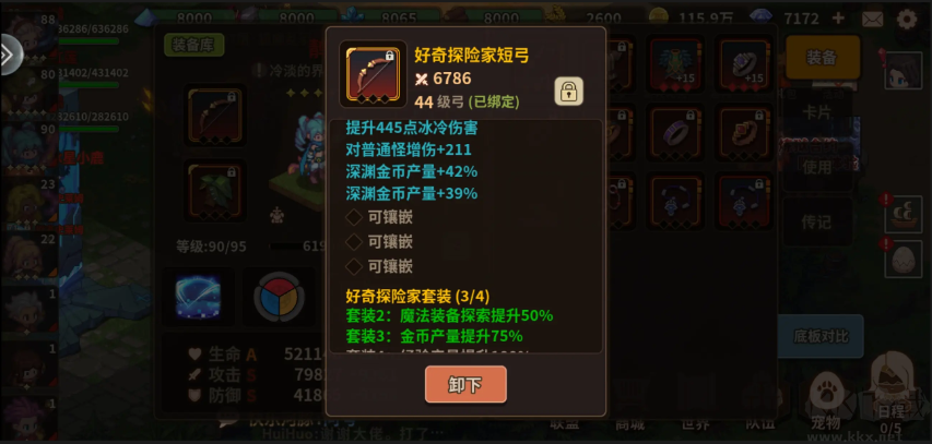 2. 套裝,好奇探險(xiǎn)家必定留三套!除了正常刷秘境以外,剩下的時間就穿著好奇套刷低級秘境。有金有藍(lán)綠裝,正好給強(qiáng)化。好奇套4條屬性中,第3和第4條一定去洗出加金幣加魔法裝備的,如圖。