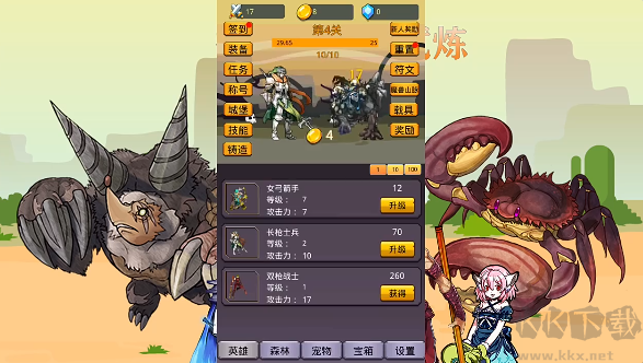 寵物玩法:基本每天看完廣告,都有很多鉆石,第一天把所有寵物解鎖,總共12個(gè),然后第一天將帶暴擊值的都點(diǎn)滿(mǎn),后面就優(yōu)先點(diǎn)暴擊傷害+所有英雄攻擊的寵物(狂暴蝸牛、哥布鳥(niǎo)、黃小俠、蝸牛獸),再然后就是加英雄攻擊的寵物,每天看完廣告就提升寵物,可以留一點(diǎn)鉆石學(xué)技能