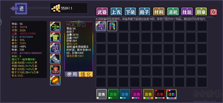 9:強(qiáng)化,每強(qiáng)化1級(jí)提升10%當(dāng)前裝備強(qiáng)化屬性武器-攻擊,衣服-血量,下裝-防御,鞋子-暴擊,暴擊每強(qiáng)化一級(jí)提升1%暴擊,所有強(qiáng)化最高值為30,背包界面左下角可以查看,當(dāng)前強(qiáng)化所需材料及概率