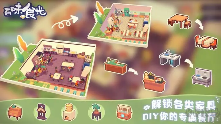 百味食光是一款中餐廳模擬器,治愈系美食之旅,烹飪不同菜系,經(jīng)營特色中餐廳。前期手動接待客人,后期全自動經(jīng)營,碎片化時間就能將餐廳做大做強(qiáng)。裝修玩法的自由度較高,擴(kuò)建地塊、編輯墻體,地板、墻壁、桌椅的樣式均可自由DIY。既好玩又能學(xué)習(xí)做菜,還不趕快來試一試。