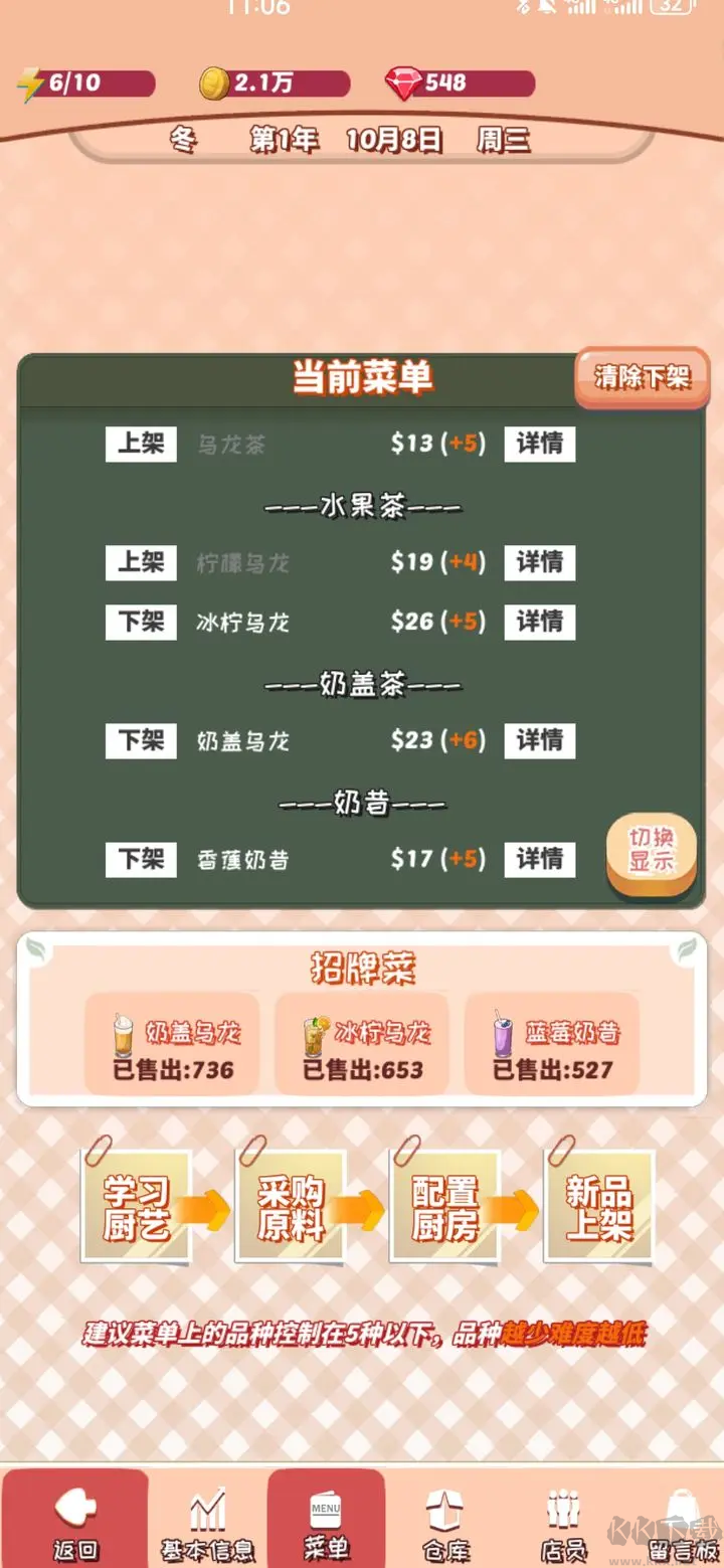 高自由度的美食經(jīng)營(yíng)游戲,快來(lái)經(jīng)營(yíng)屬于你自己的茶飲店和烘焙店。奶茶、奶蓋茶、水果茶、奶昔、冰沙、餅干、蛋糕、面包、派、蛋撻等等應(yīng)有盡有。游戲包含最最仿真的店鋪經(jīng)營(yíng)元素,從采購(gòu)原料、討價(jià)還價(jià),到學(xué)習(xí)菜譜、定制菜單,還有聘請(qǐng)/管理店員,需要仔細(xì)考量收支平衡,才能從白手起家到日進(jìn)斗金。