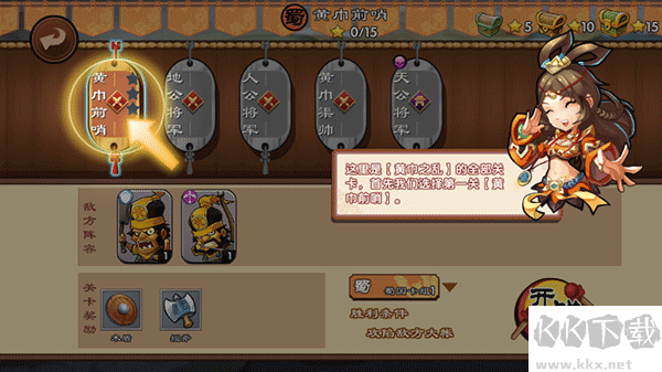 5、此處展示的是【黃巾之亂】的全部關(guān)卡。首先,我們選擇第一關(guān)【黃巾前哨】。關(guān)卡下方所顯示的內(nèi)容,分別為該關(guān)卡將會出現(xiàn)的敵人、通關(guān)后可獲取的物品以及通關(guān)條件。確認(rèn)無誤后,點擊右下角的 “開戰(zhàn)” 按鈕,即可正式啟動。