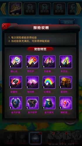 3、探險寶箱寶箱到底能獲得什么呢?當(dāng)然是好東西,看到圖中一堆紫色極品裝備是不是心動了呢,不僅如此還能獲得隨機(jī)的藍(lán)及紫裝、隨機(jī)藍(lán)及紫色寶物碎片、金色的法寶及變身器能源、還有藍(lán)色品質(zhì)的角色哦。如此豐厚的回報,讓探險的樂趣再度升級。