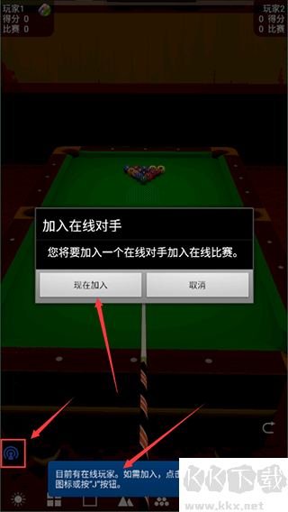 4、完成上述選擇進(jìn)入球桌界面,若有在線玩家,屏幕左下角有提示,點(diǎn)按鈕選 “現(xiàn)在加入”,開啟匹配 。