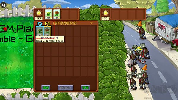 4、從選項(xiàng)框中挑選植物,確定后點(diǎn)擊開始戰(zhàn)斗,準(zhǔn)備迎接僵尸挑戰(zhàn)。