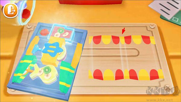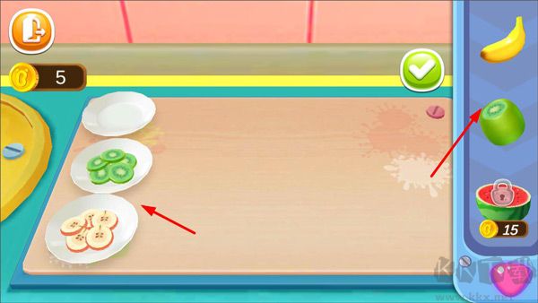 3、添加果醬后,切些水果放入。點(diǎn)擊右側(cè)水果,置于案板,切成合適大小備用。