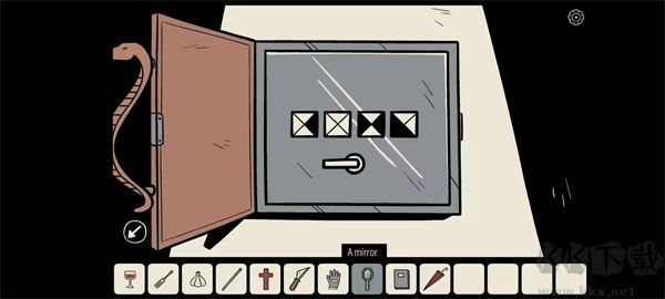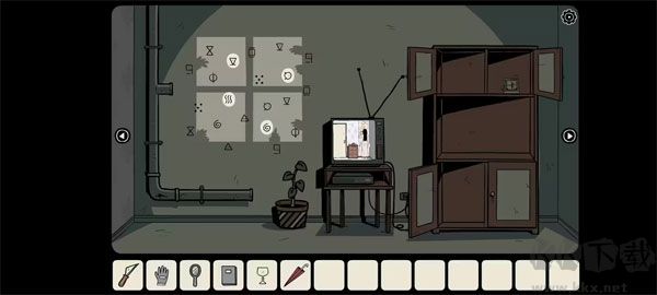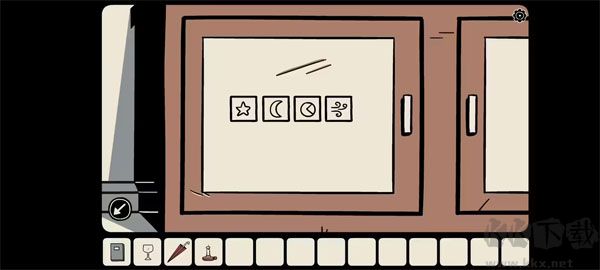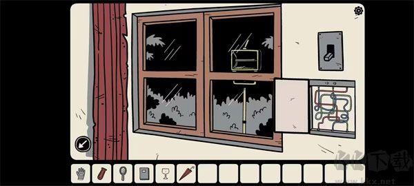 鑰匙可以打開電視機旁大柜子底下的一扇門,得到玻璃碗。來到房門前,安上開關面板,可以打開或者關上屋中的電源了。現在關上電源,戴上絕緣手套去擺弄窗戶邊的電線,把它們接好后,按下上面的開關,屋外的強光燈開啟了。你拉上窗簾,看到那上面有幾個破孔,強光透過破孔照射在對面墻上,映出特定的幾個符號。你看向那面墻,忽然一個黑影閃過嚇了你一跳。墻上映出的符號結合書中的提示便是窗下密碼鎖的答案。就在你解鎖時,一只手慢慢搭在了你的肩膀上,你一驚,轉頭看了看,卻看到身后什么都沒有。抽屜里是一根撬棍。