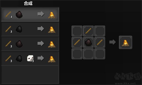 7、營(yíng)火:準(zhǔn)備三個(gè)木頭和一個(gè)煤炭,進(jìn)行合成營(yíng)火。