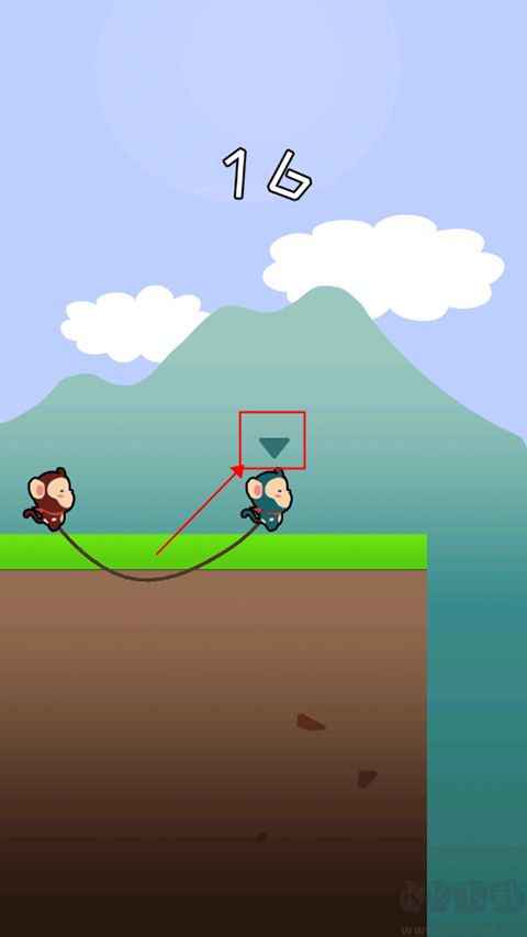 2、人物頭上有小三角標(biāo)的一方為當(dāng)前可操控角色,按住屏幕即可跳躍;