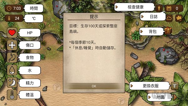 7、在地圖選新地方探險,擴大生存區(qū)域,成功后獲材料,每天產(chǎn)新材料。