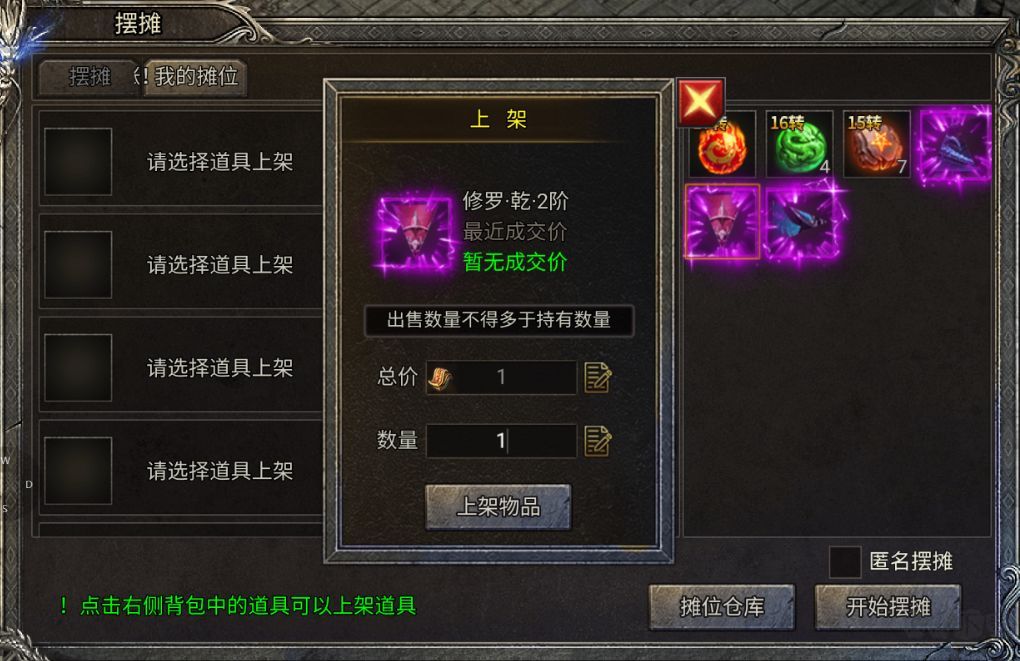 8、有多余裝備或道具想出售,可通過游戲內(nèi)擺攤系統(tǒng),將不綁定的放到上面出售,數(shù)量不超持有量。?
