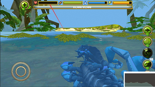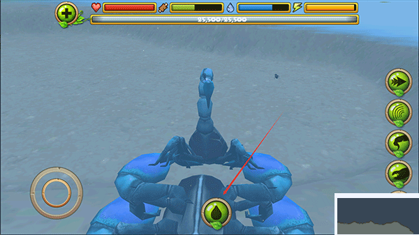 1、進入體驗后,將化身一只蝎子;左側(cè)控制移動,右側(cè)按鈕從上至下依次為加速、眩暈、尾刺攻擊、鉗子攻擊、進食。