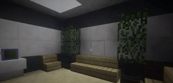 在另一邊還要給我們的口袋妖怪玩家做一個(gè)電腦, 再用鐵砧和橡樹樹葉做一些綠化, 當(dāng)然還有凳子 ,可以用樺木樓梯。