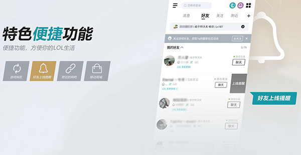 特色便捷功能,方便你的LOL生活!游戲轉(zhuǎn)區(qū)、好友上線提醒、附近的網(wǎng)吧、移動商城等豐富的便捷功能等你來體驗(yàn)!