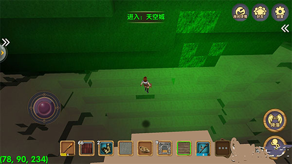 游戲的左下角有一個(gè)坐標(biāo)指示,最后一個(gè)坐標(biāo)接近200的時(shí)候玩家就到天空城了。天空城上有很多稀奇古怪的東西,白天只會(huì)出現(xiàn)小動(dòng)物,到了晚上各種各樣的大怪物就出現(xiàn)了。不過(guò)這種情況多出現(xiàn)在普通模式里,創(chuàng)造模式中玩家基本上很難遇到怪物,因?yàn)樵谶@個(gè)模式中玩家是等同于上帝的存在。