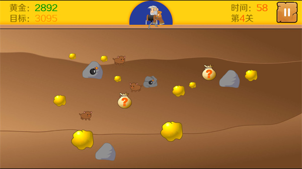 3、經(jīng)典的游戲玩法,利用鉤子去抓住各種物品,不斷的提高自己的財富。