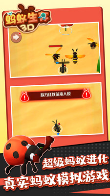 螞蟻生存3D玩家在蟻群中扮演一只螞蟻。為了自己的族群的發(fā)展,需要不斷地戰(zhàn)斗獲取資源,強(qiáng)化發(fā)展能力,升級到不同的兵種,不斷收集資源壯大種族!