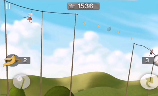 游戲的頁面非常簡潔,左邊的拐杖按鍵是用來鉤掛纜繩或者凸起物,在游戲中后期難度提升時會加入這個元素。