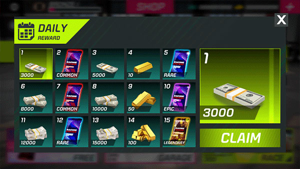 2、選擇好后,就能夠看到底部的各種賽事了,左上角還可以領(lǐng)取每日獎(jiǎng)勵(lì),準(zhǔn)備好酒店及【RACE】開始第一場較量吧。