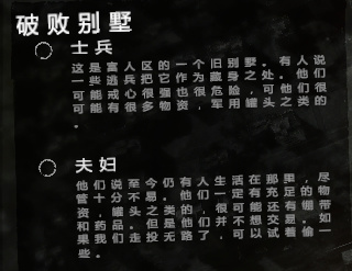 劇情一:商人,顯示可能的交易,從地圖左側(cè)進(jìn)入,搜刮左邊房子的物資就好,帶上撬棍跟一個鋸子,不建議放養(yǎng)。