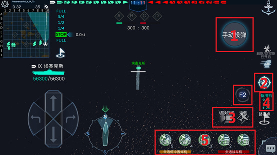 圖為魚雷機(jī)操作界面,紅色方框?yàn)榭赏蟿?dòng)投彈方向,綠色范圍為魚雷投彈后的覆蓋范圍和路線,也需要一定的預(yù)判哦!