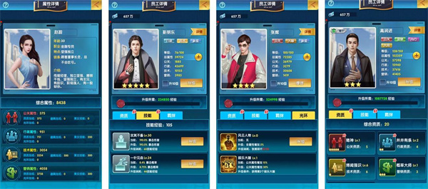 1、資質(zhì)加成:每個(gè)員工都有至少四種資質(zhì)(四種屬性),資質(zhì)分星級(1-4星資質(zhì)有兩種方案,5星資質(zhì)有三種方案),選用方案可對資質(zhì)進(jìn)行升級提升屬性上限