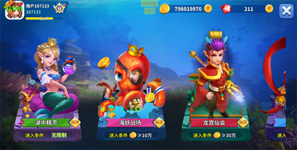 3、傳統(tǒng)的“打魚”玩法,還有新穎的“道具卡牌”、“金幣互動”等創(chuàng)新玩法,使游戲更加有趣和多樣化。