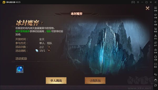 冰封魔窟也是玩家快速獲取經(jīng)驗(yàn)的重要途徑,冰封魔窟副本每日可以挑戰(zhàn)兩次,不論單人還是組隊(duì)都可以進(jìn)入戰(zhàn)斗?。